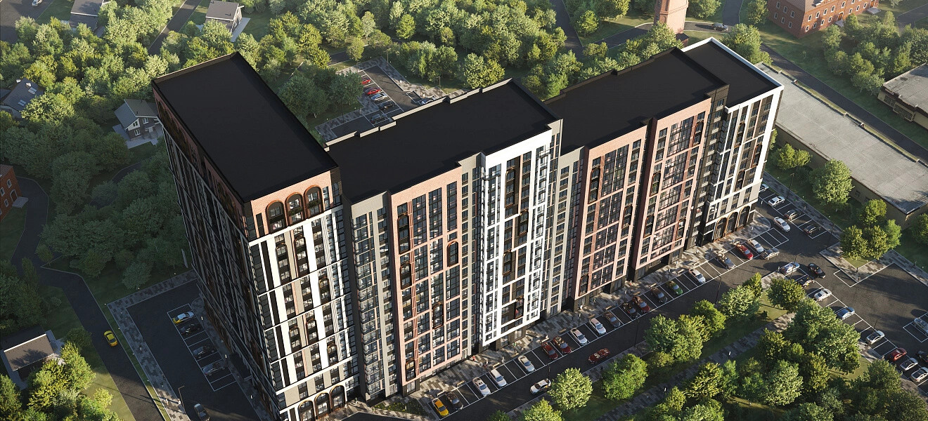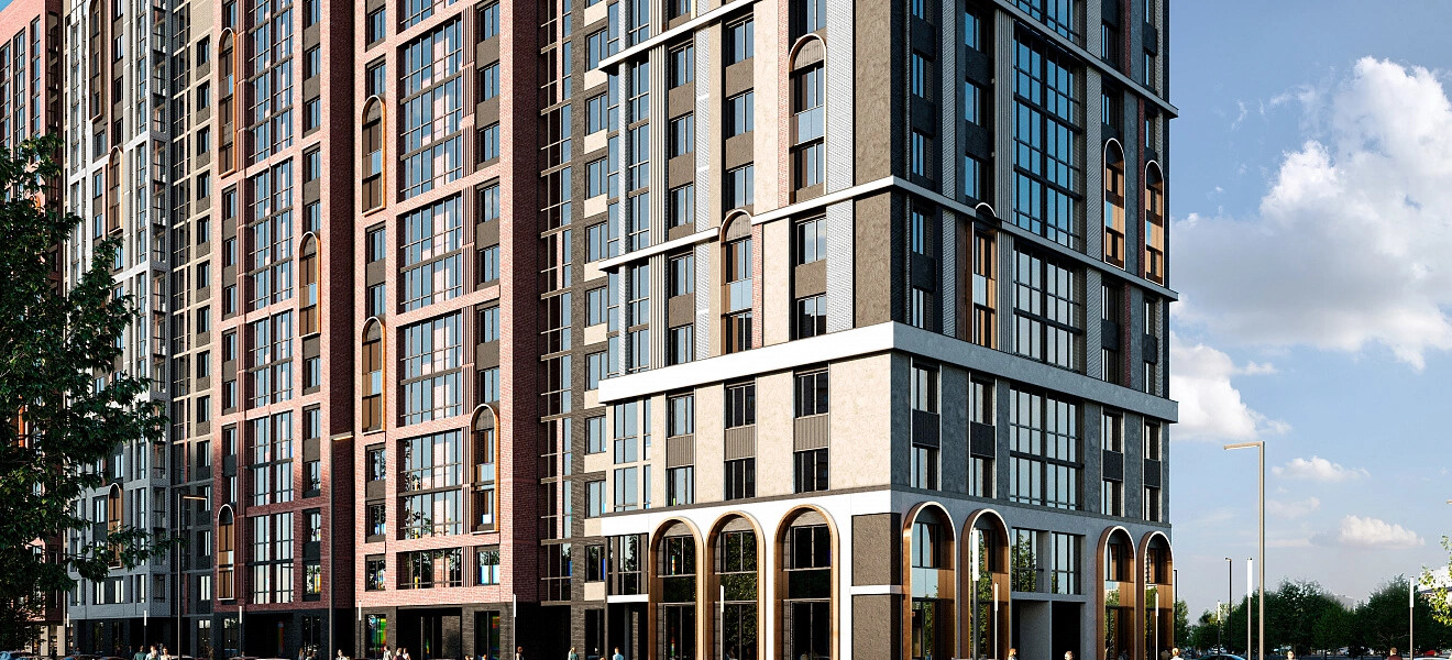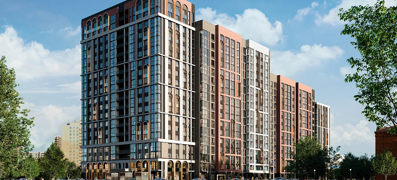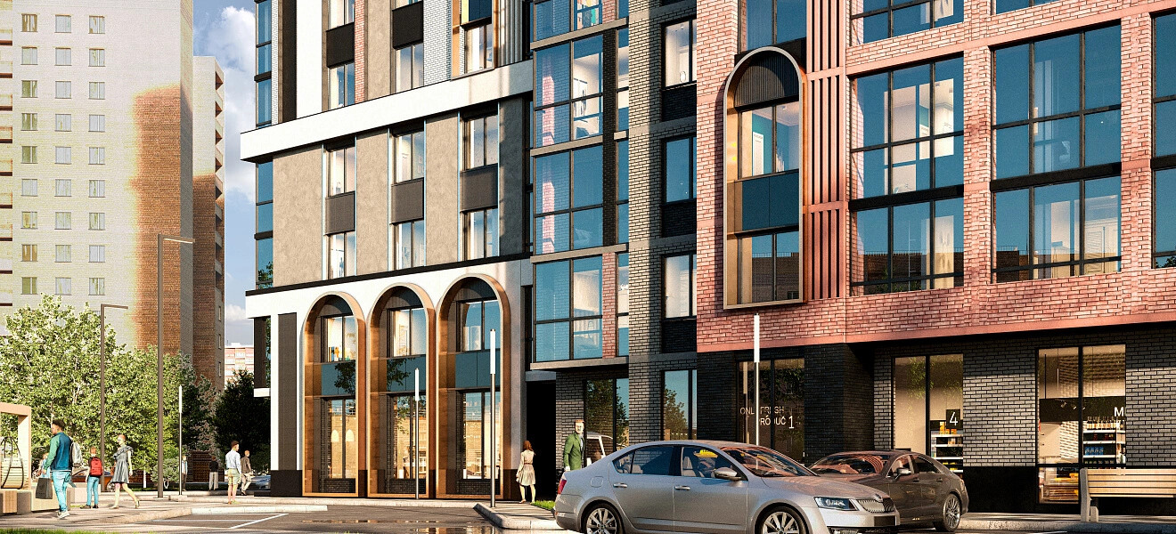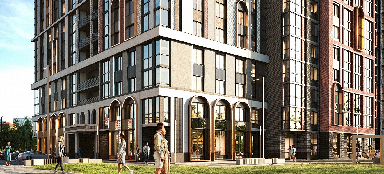 Панорамное остекление, глубокие природные цвета фасада с акцентными медными арками, разнообразие форм и лаконичные детали делают комплекс непохожим на другие.