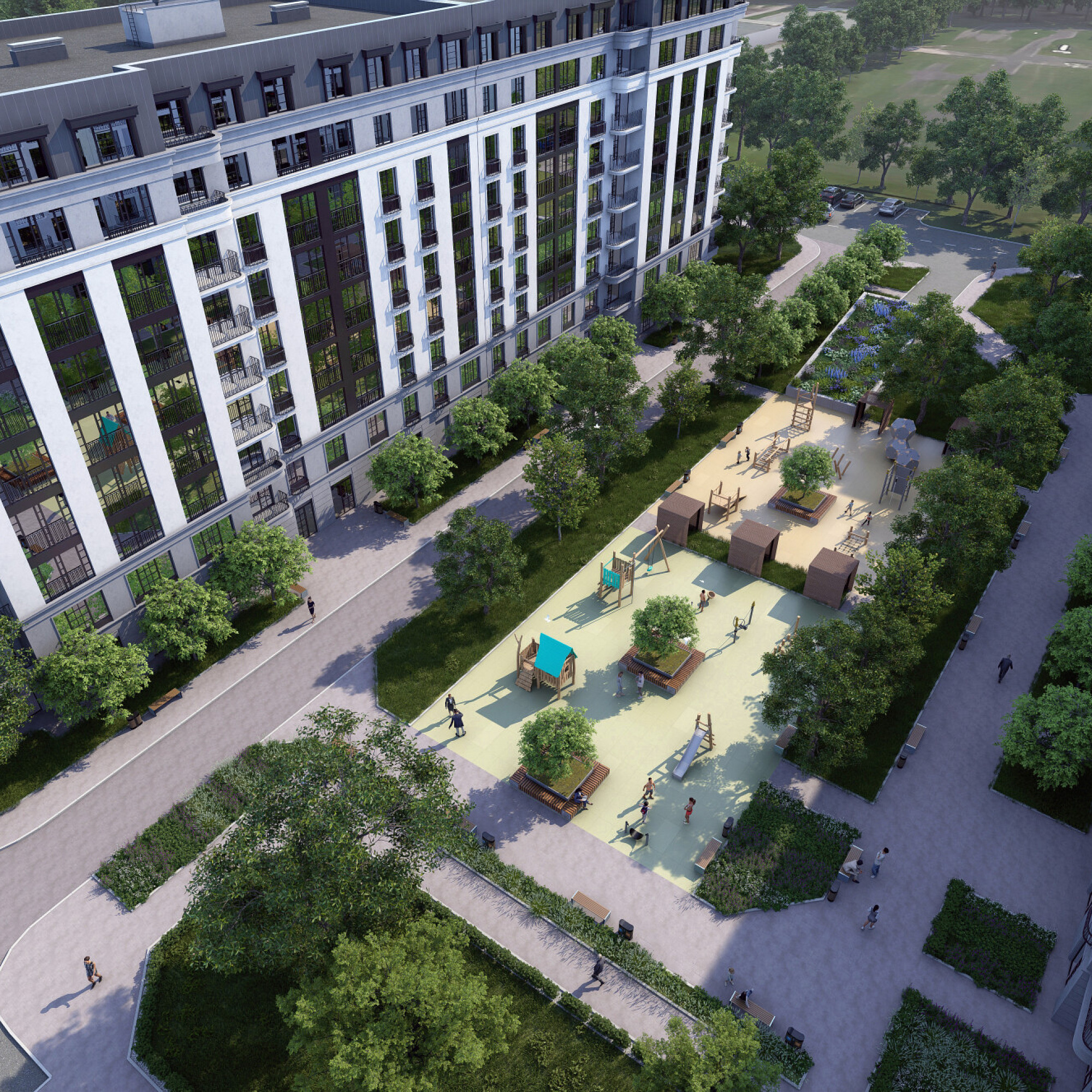 Ландшафтный дизайн с газонами, деревьями и клумбами улучшает качество воздуха, снижает шум и создает приятную атмосферу.