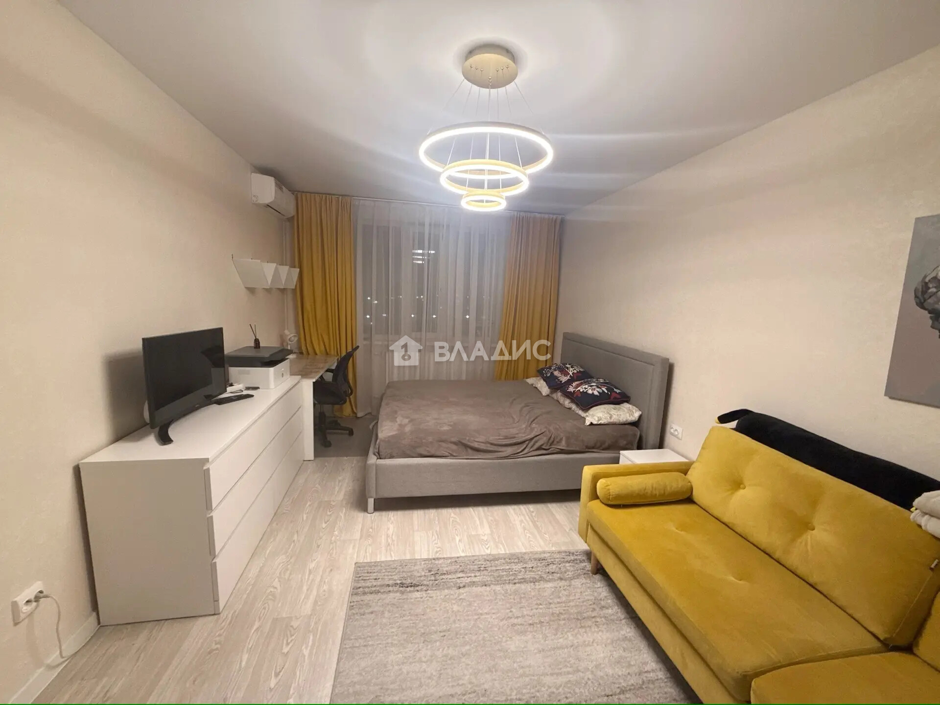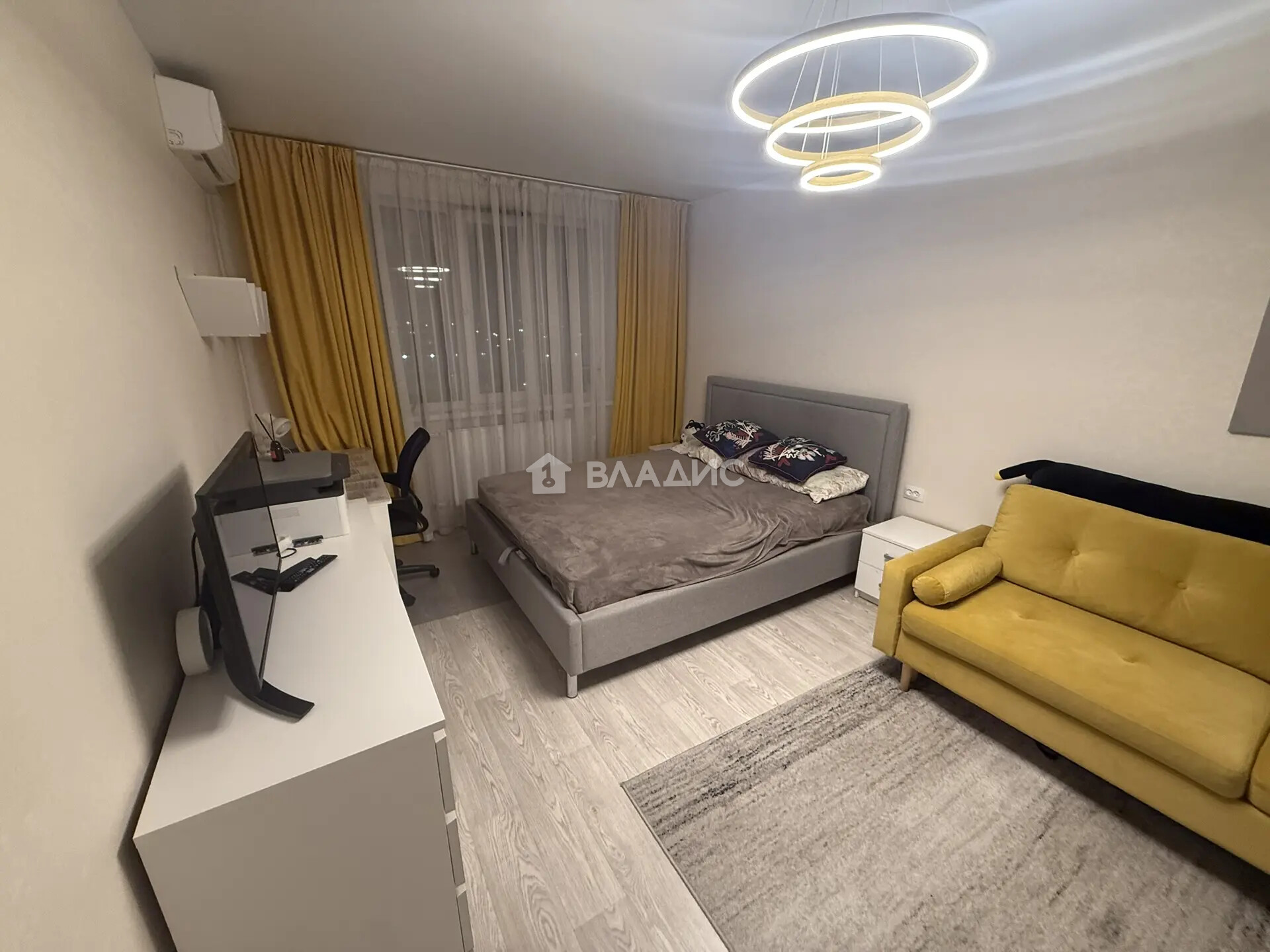 В комнате: два вместительных шкафа, рабочий стол, кровать, кондиционер