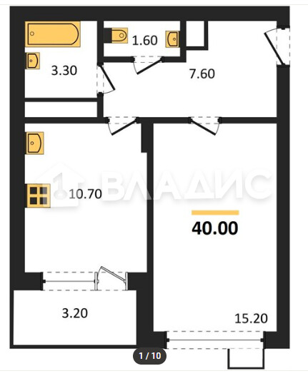 - Площадь кухни 10.7
